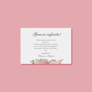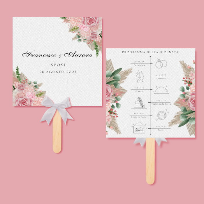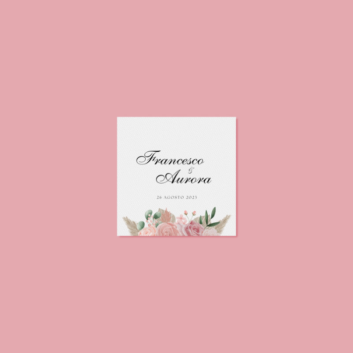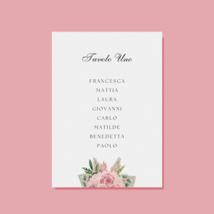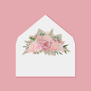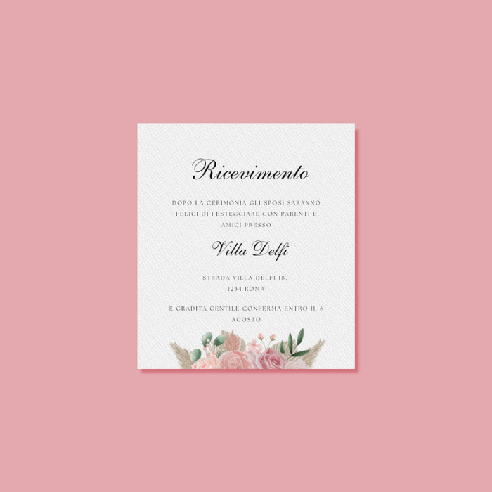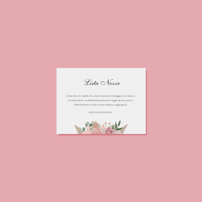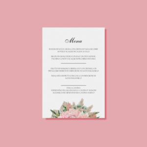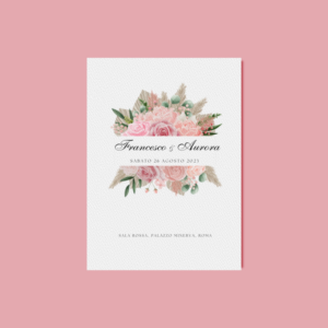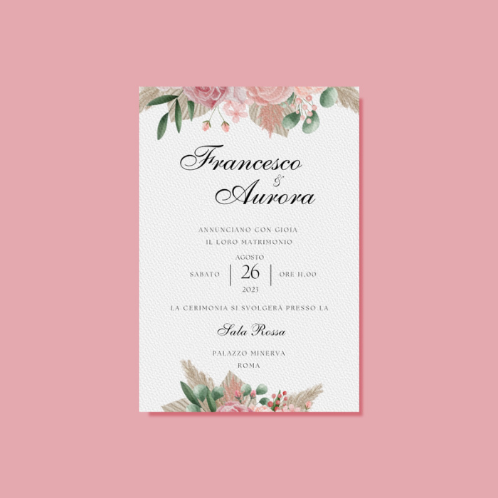 Pampas e palme unite a fiori delicati e freschi come rose, peonie, astilbe e boccioli. I colori scelti sono pastelli morbidi e delicati che si combinano perfettamente con gli elementi naturali. Può essere abbinato a buste in carta kraft, bianche o colorate. Splendida la stampa su carta martellata, bianca o neve.