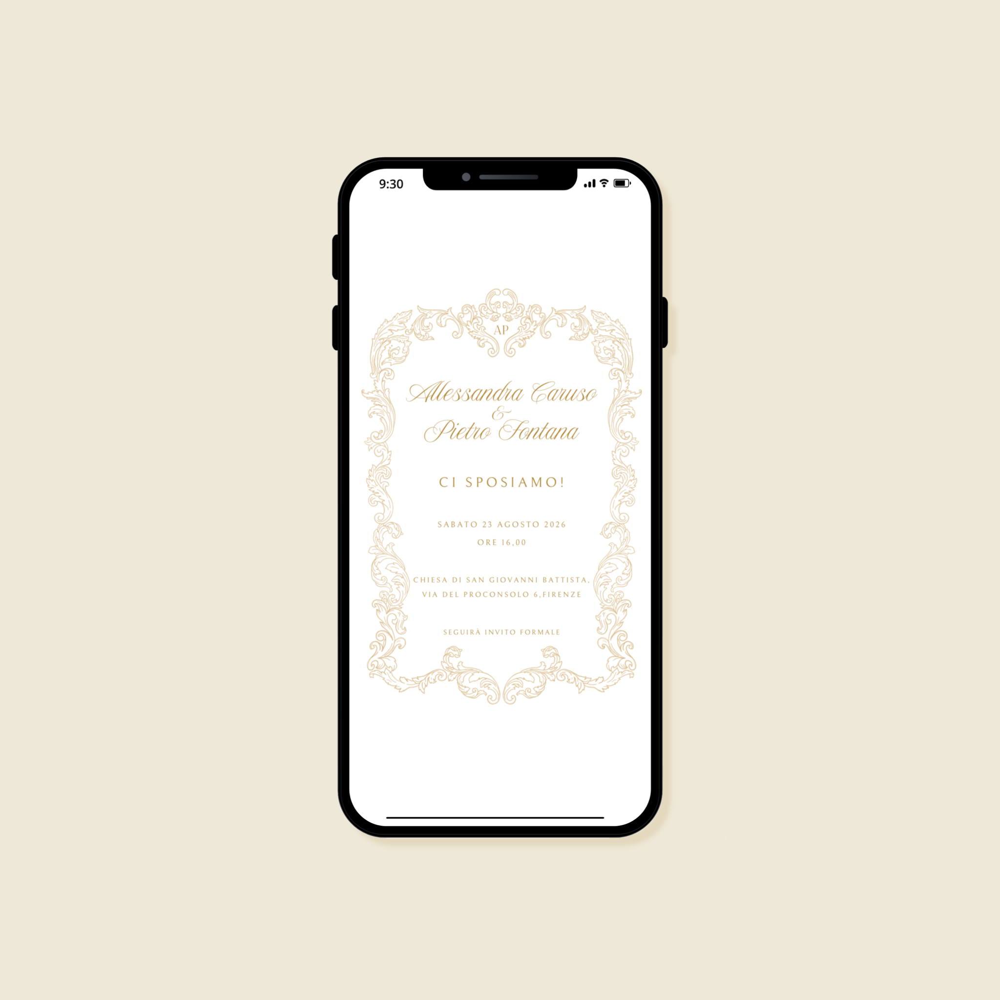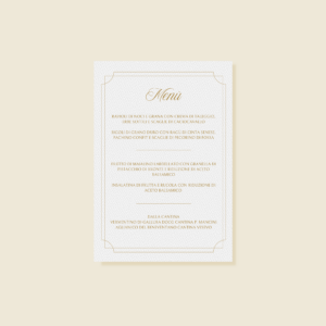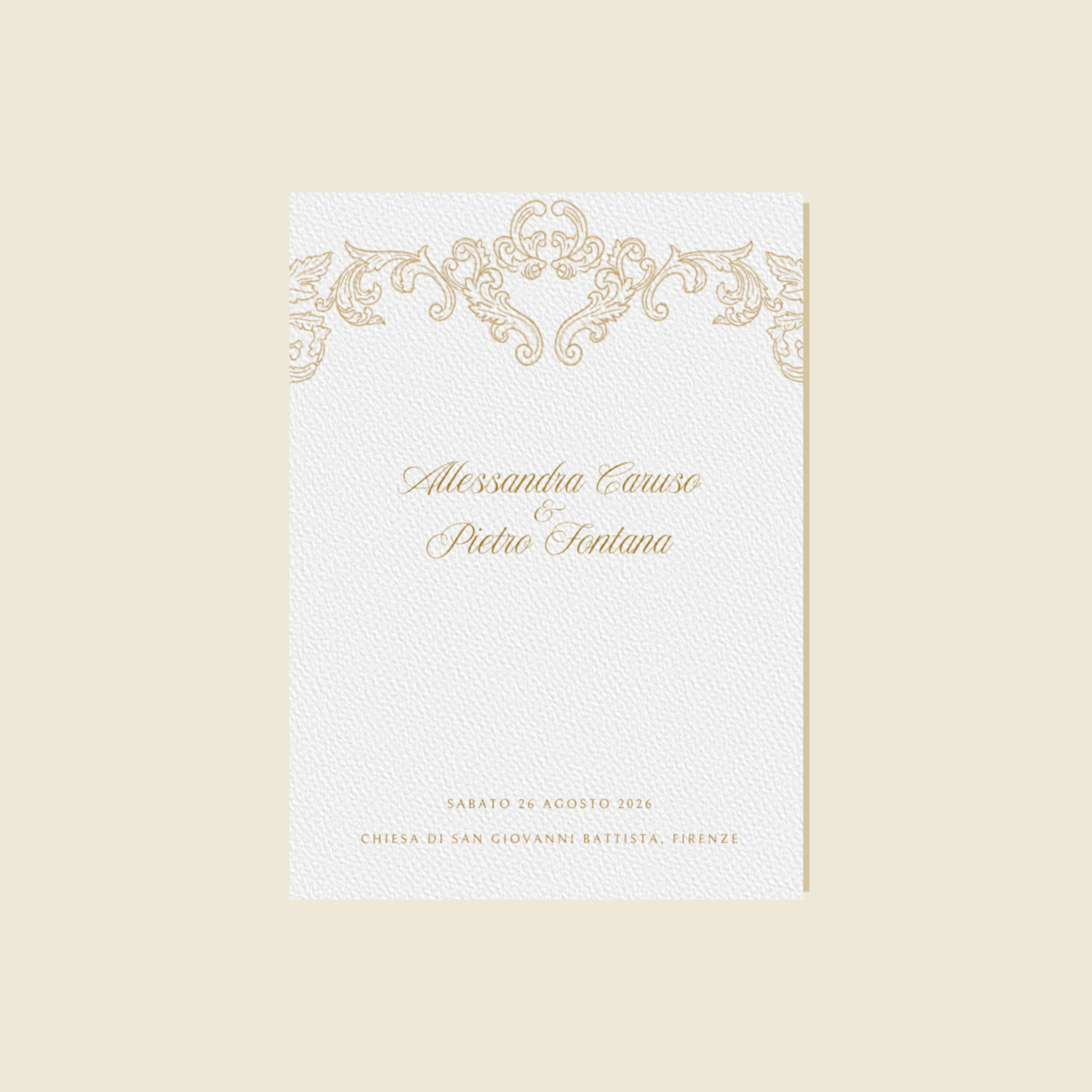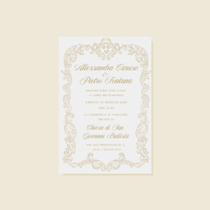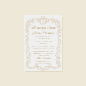 Magnolie diamanti e upupe si fondono in un design intramontabile con dettagli barocchi. I toni dorati delle partecipazioni si abbinano perfettamente sia a carta liscia che lavorata. Ideale per un matrimonio sofisticato, può essere abbinato a buste avorio o artigianali.